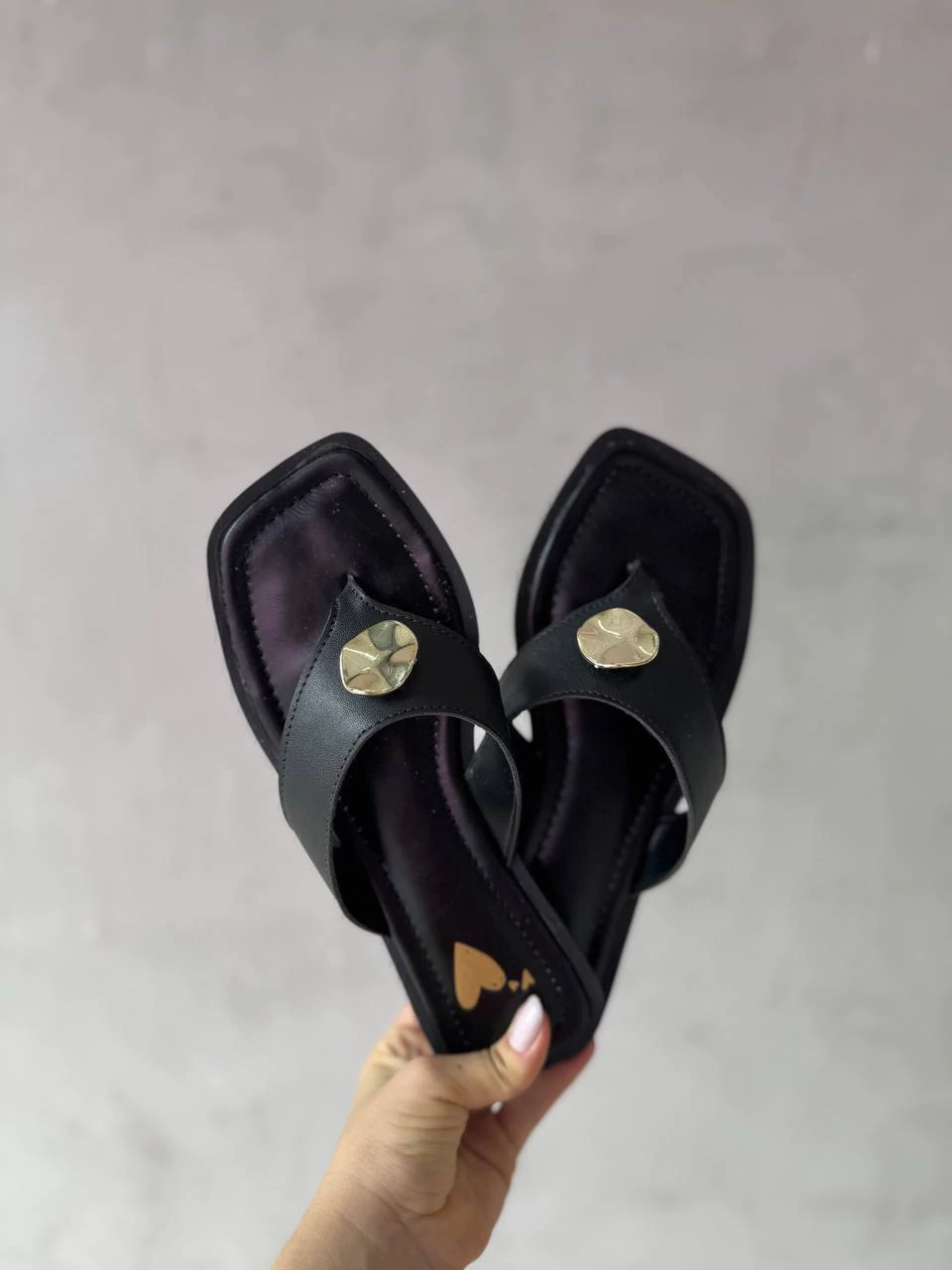 Descrição: Rasteira bico quadrado, com aplicação em ouro light. Nossos calçados acompanham espuma na palmilha, além de super práticos e feitos pra você arrasar.