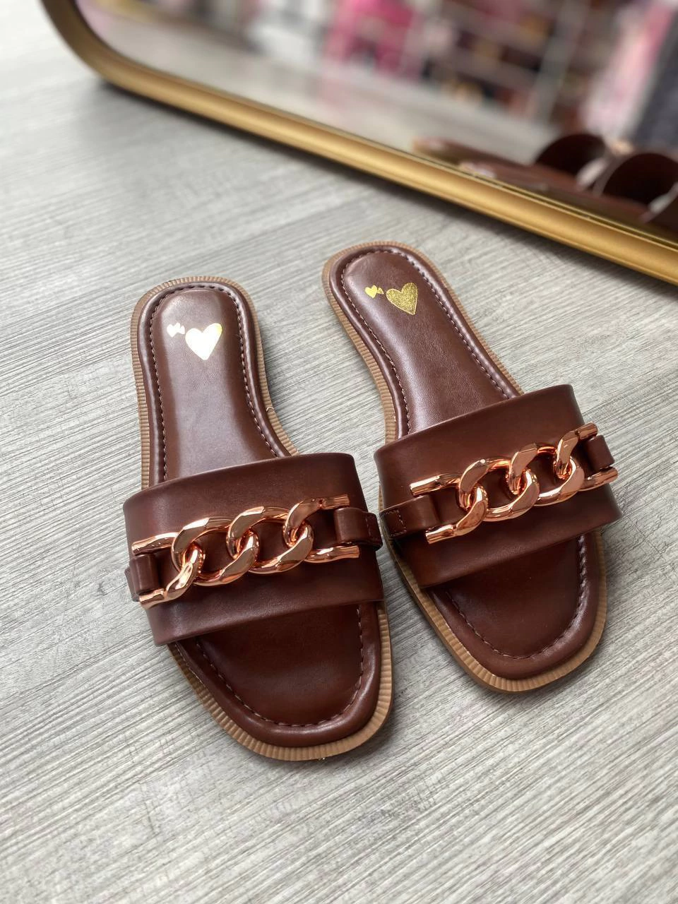 Descrição: Rasteira bico quadrado, com detalhe em corrente no tom rose gold. Nossos calçados acompanham espuma na palmilha, além de super práticos e feitos pra você arrasar.