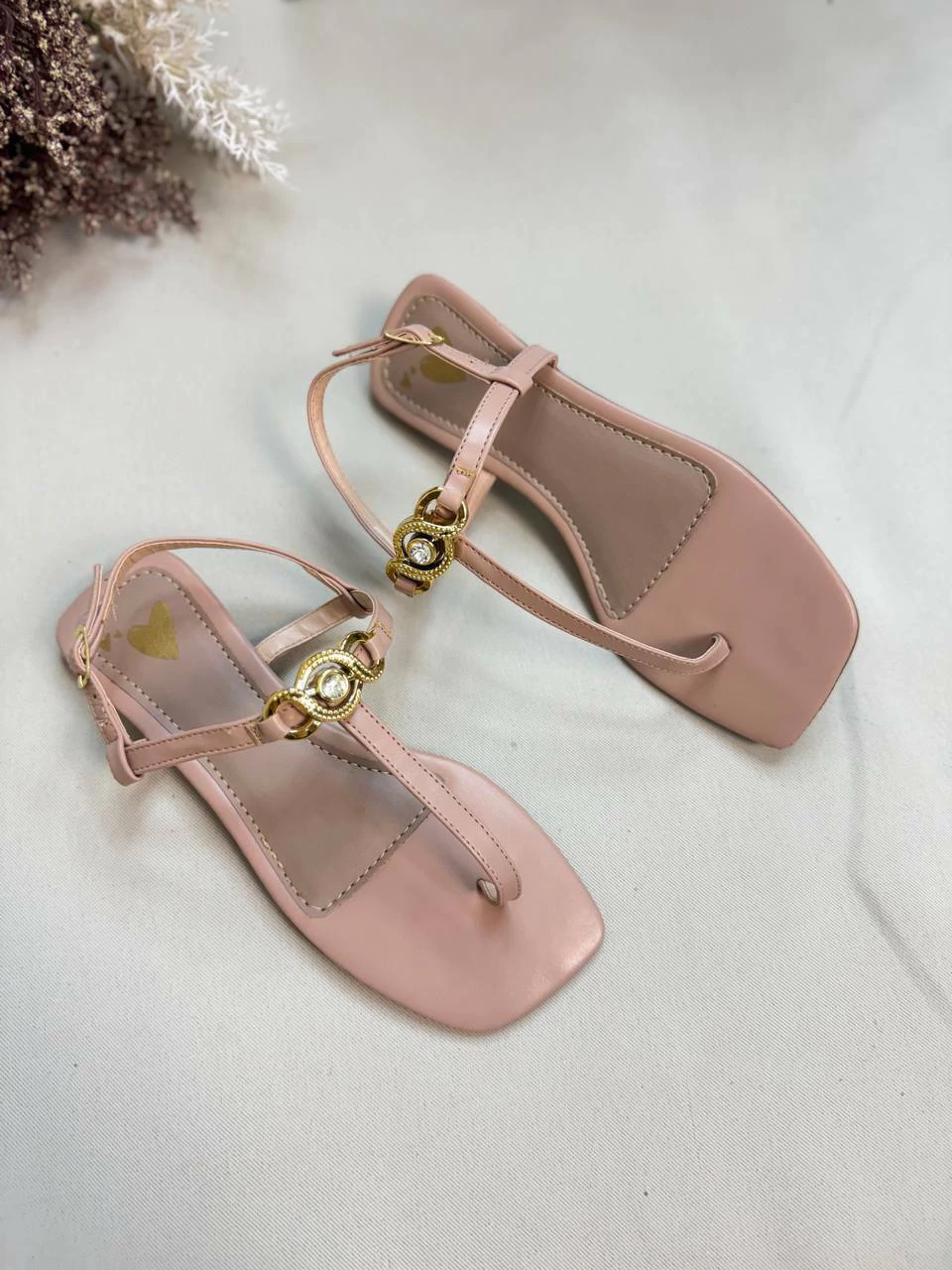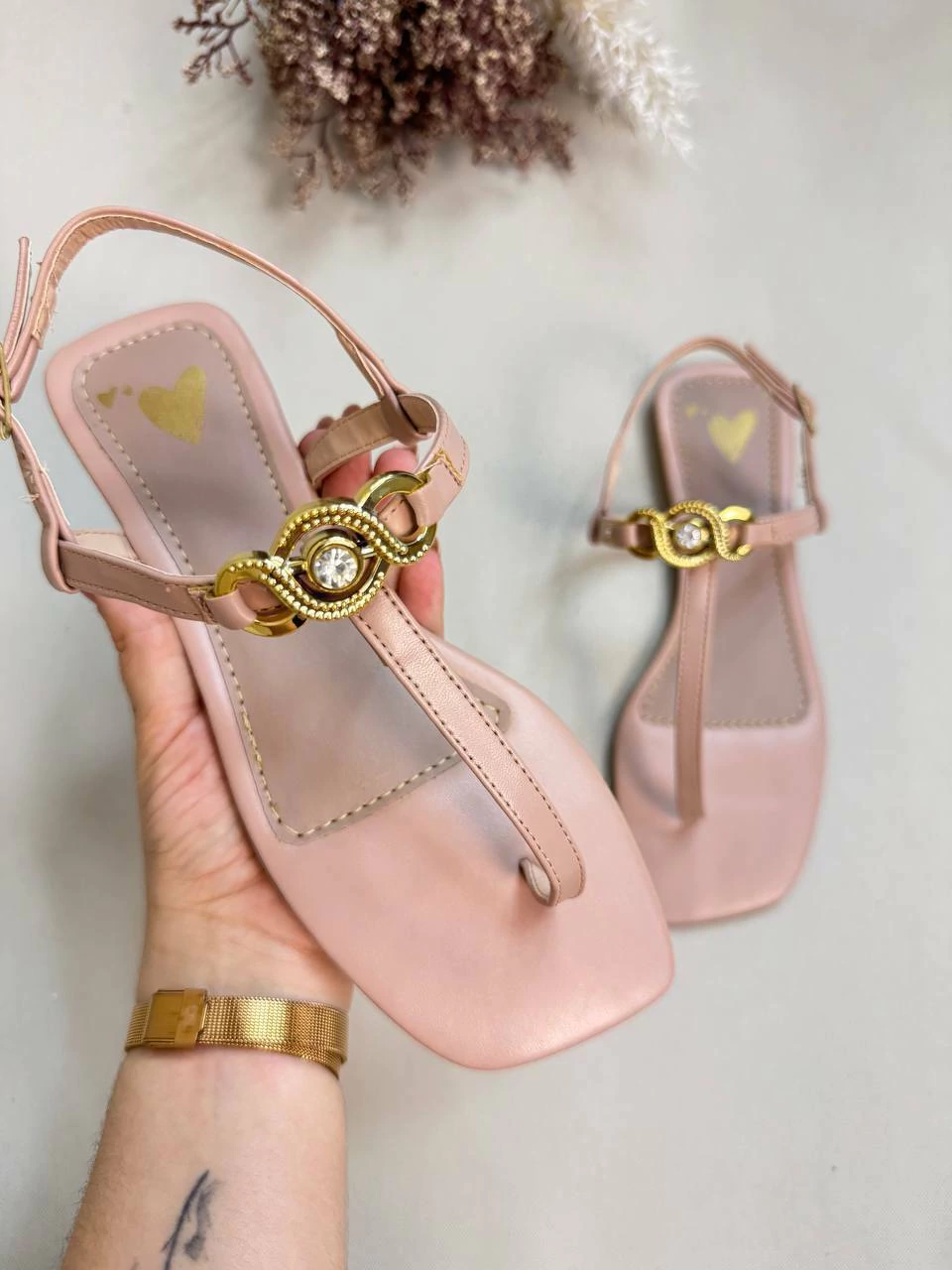 Descrição: Rasteira bico quadrado, com aplicação em ouro light e pedrinha. Nossos calçados acompanham espuma na palmilha, além de super práticos e feitos pra você arrasar.