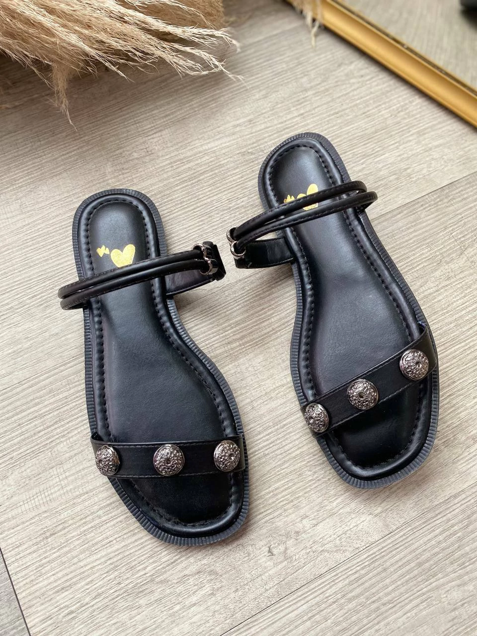 Descrição: Rasteira, modelo 2 em 1, bico quadrado, com aplicação em ouro light. Nossos calçados acompanham espuma na palmilha, além de super práticos e feitos pra você arrasar.