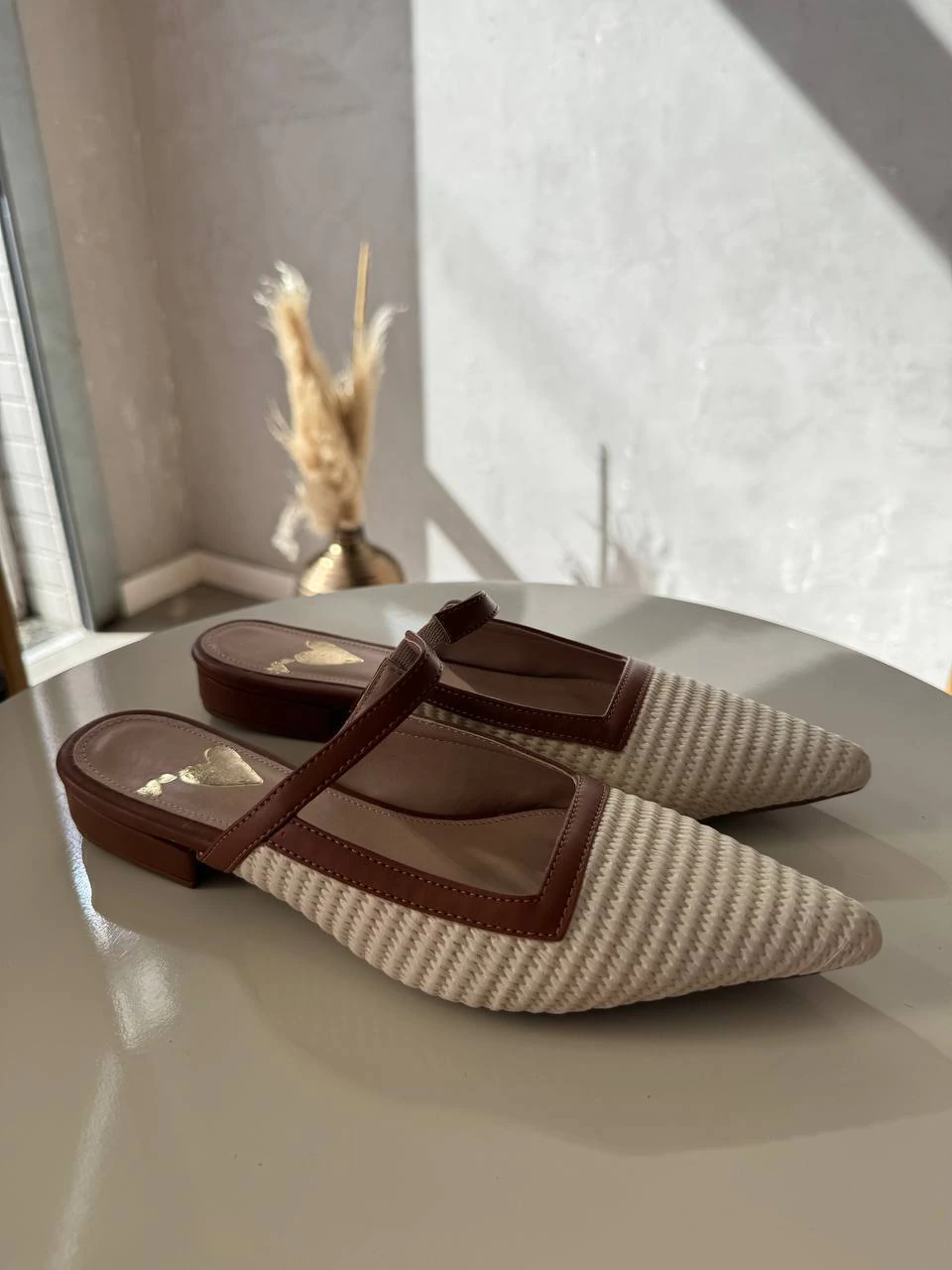 Material: Modelo em napa com textura ráfia e solado antiderrapante (PVC).
